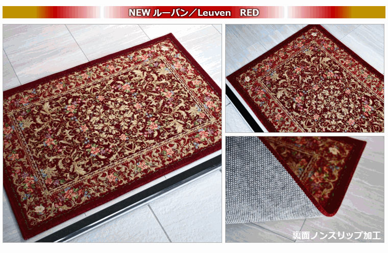 NEW ルーバン Size Variation マット50×80cm ¥2,980(税込み) マット60×90cm ¥3,980(税込み) マット68×120cm ¥5,480(税込み) 約2畳 ラグ200×200cm ¥15,500(税込み) 約3畳 ラグ200×250cm ¥19,500(税込み) 約4畳 ラグ200×290cm ¥22,500(税込み) 約6畳 ラグ240×330cm ¥29,500(税込み) Color1 :『レッド』 Color2 :『アイボリー』 Color3 :『ネイビー』 フランス王朝時代に生まれたゴブラン織は、数種の色糸を使い、クラシックな重厚感と 気品ある華やかな柄が特徴 多くの人を魅了し続けています!シェニール糸(ビロード糸)を使用し、肌触りが柔らかく、 その重厚さ上品さ華麗さはルネッサンス文化を経て現在も生きつづけています。